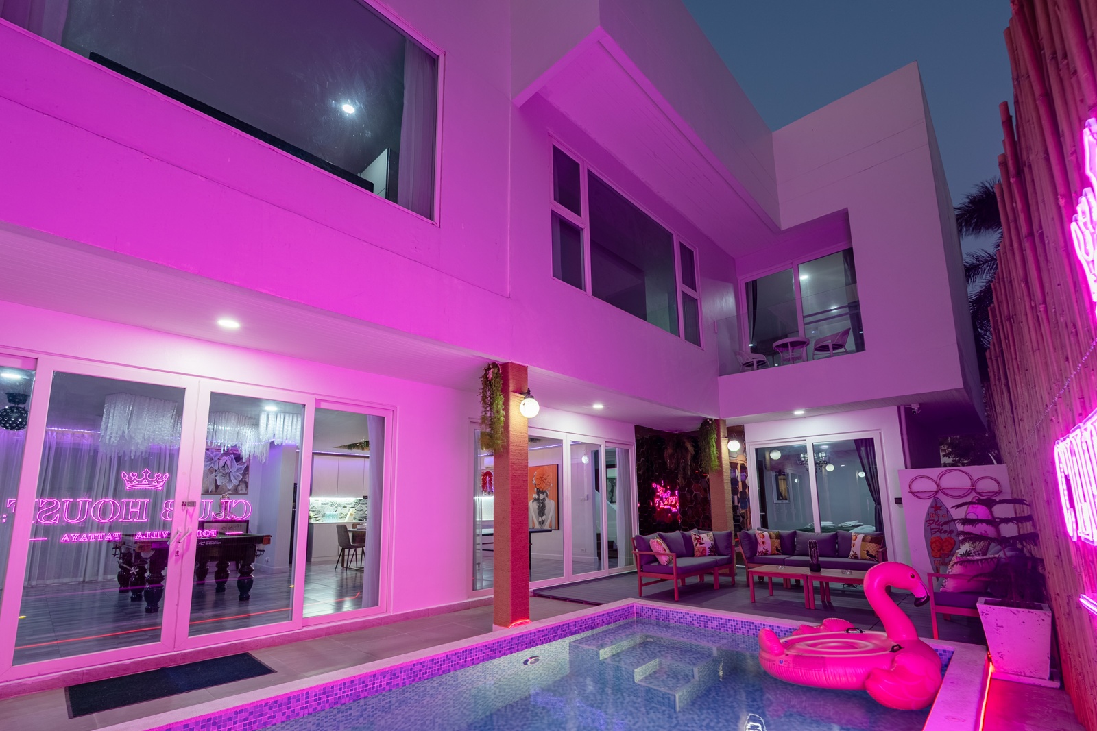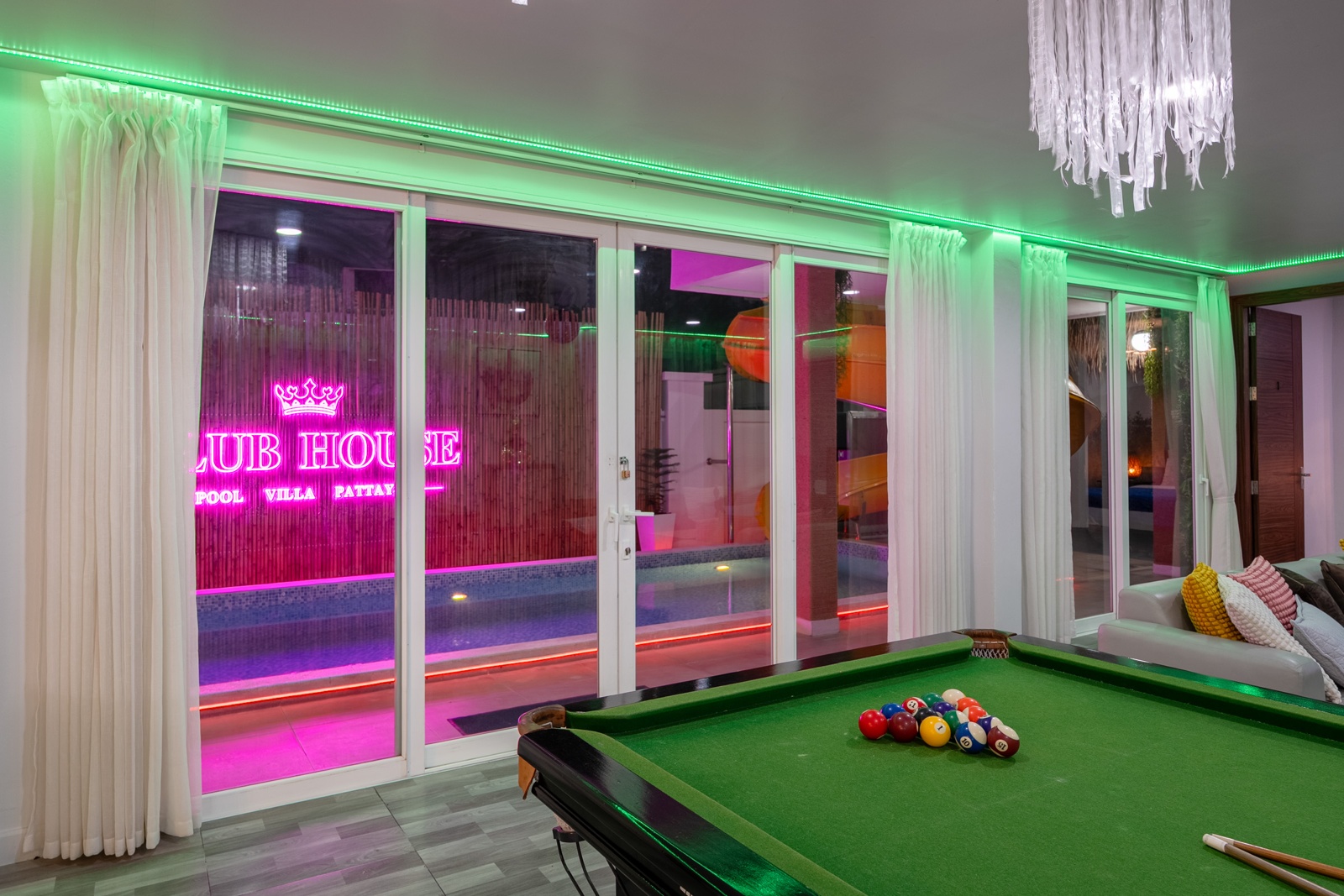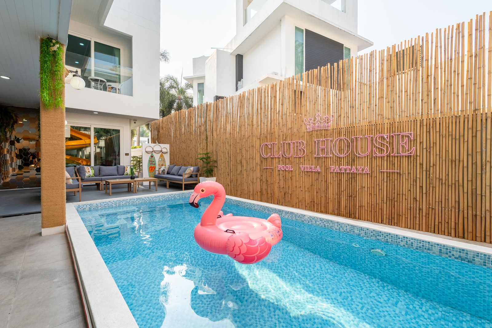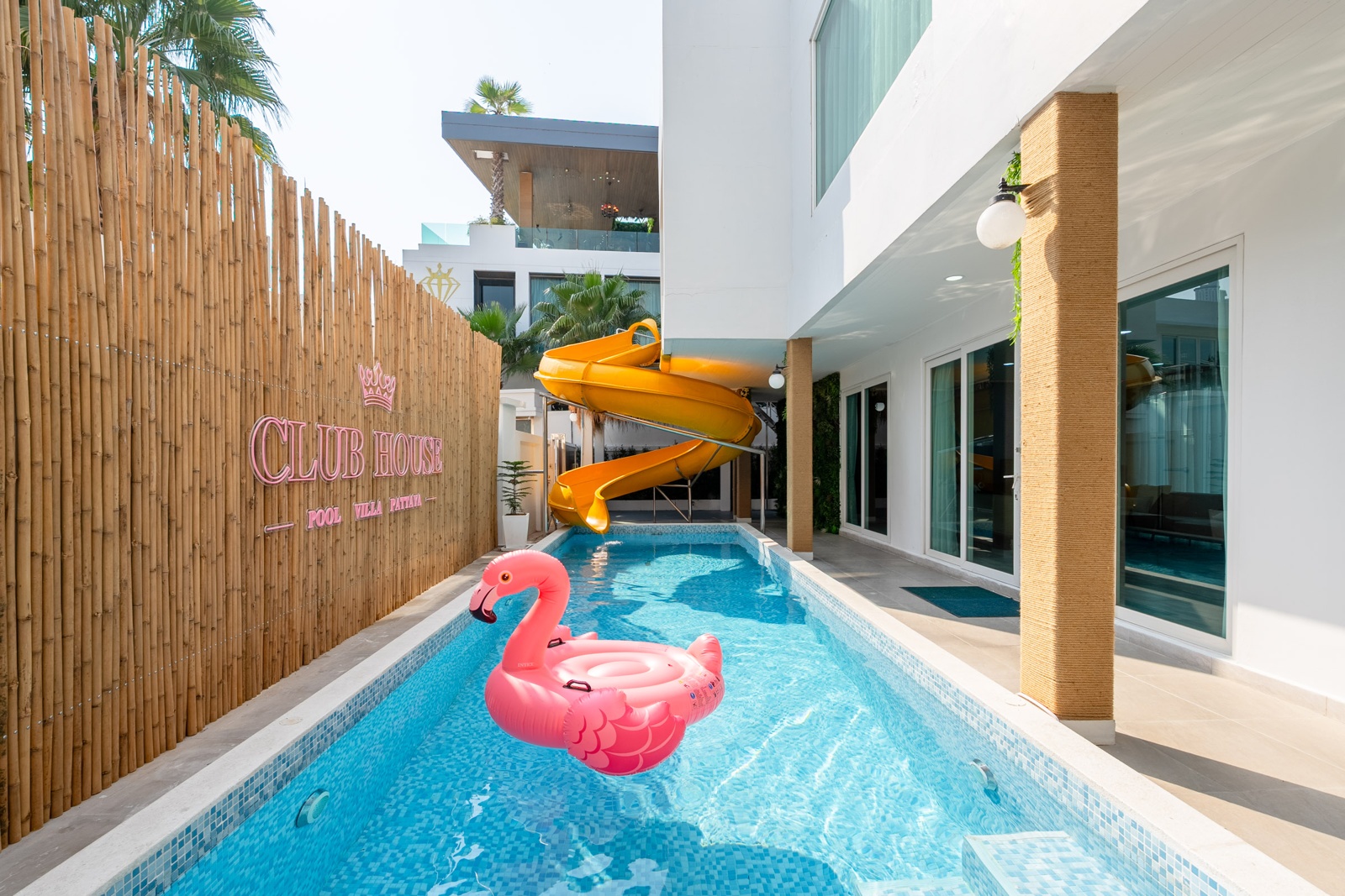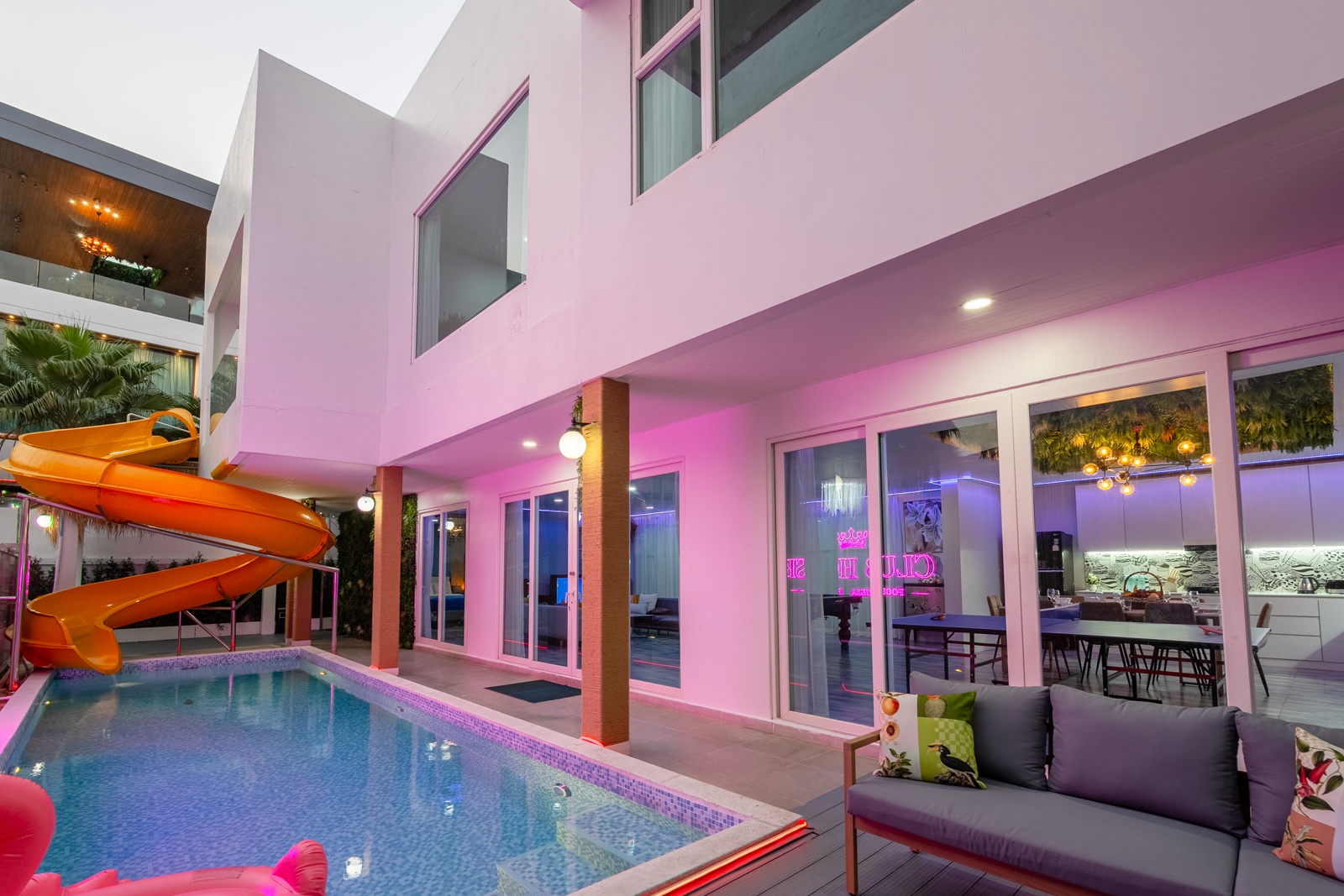 CLUB House Pool Villa Pattaya - This beautifully designed holiday villa spans 2 storeys and offers guests a luxurious and private retreat, complete with its own swimming pool and waterslide. The outdoor living and dining areas are spacious, shaded, and elegantly furnished, creating the perfect setting for relaxing by the pool or enjoying time together in comfort. The villa features 7 stylish bedrooms, 6 of which have en-suite bathrooms, plus, there is an additional guest toilet for convenience. All rooms are furnished in a contemporary style with a modern, relaxed holiday atmosphere. The villa comfortably accommodates large groups and families, making it ideal for both leisure and special occasions. The ground floor boasts a bright open-plan living area with dining space and a modern fully equipped kitchen, perfect for guests who enjoy self-catering. The villa is very well equipped with LCD TV, full air-conditioning throughout, and high-speed Wi-Fi. Furnishings and décor are modern, elegant, and comfortable, designed to provide a true home-away-from-home experience. For entertainment, guests can enjoy the pool table for private games, as well as a karaoke sound box for fun evenings together. For your peace of mind, the villa is fitted with a safety box and benefits from additional security at the main gate. Your reservation rate includes electricity and water usage, Wi-Fi, safety box, and the service of a private villa manager to assist you during your stay. Fresh towels, bed linen, toiletries, and drinking water are provided upon arrival. These items can be replenished or changed for an additional charge — please ask for details. For long-term rental inquiries, please contact our team for special rates. We will be happy to offer you our best price. Welcome to Villa By Owner in Pattaya — where comfort, privacy, and luxury meet.