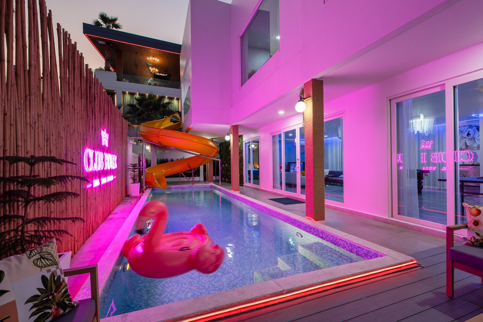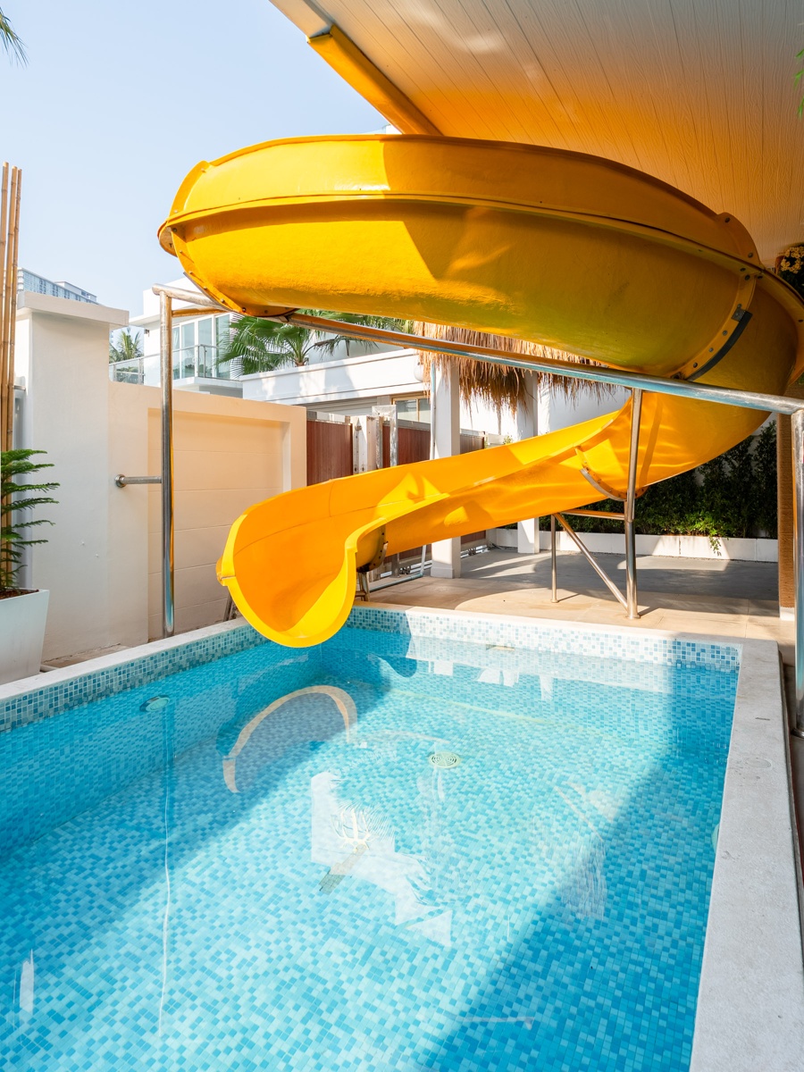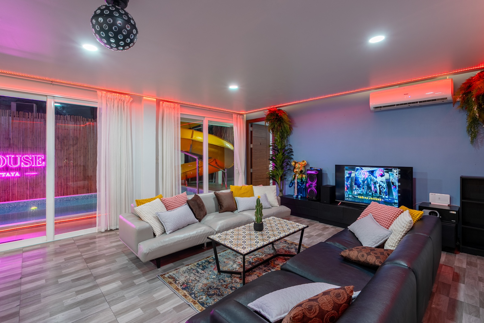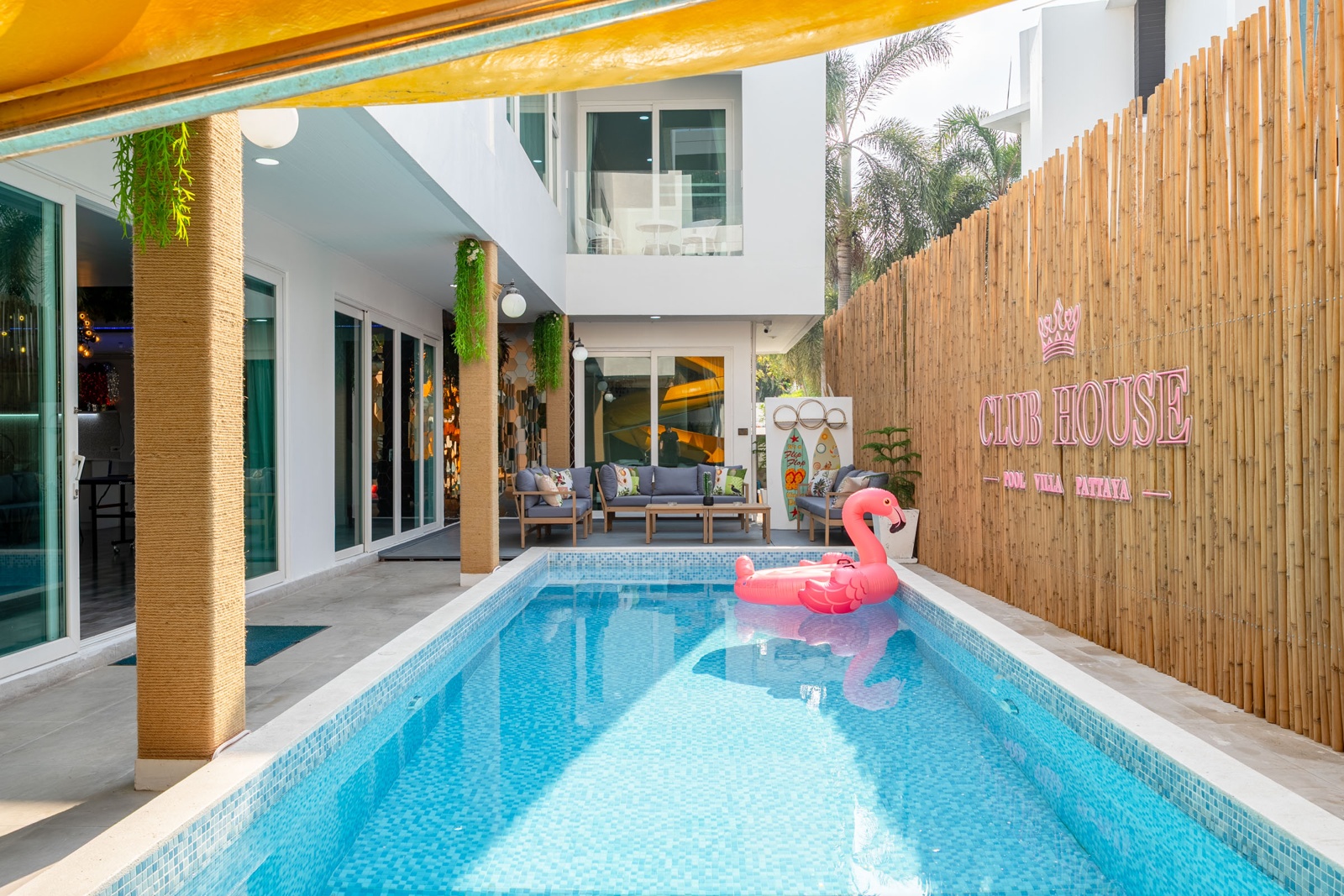 CLUB House Pool Villa Pattaya - This beautifully designed holiday villa spans 2 storeys and offers guests a luxurious and private retreat, complete with its own swimming pool and waterslide. The outdoor living and dining areas are spacious, shaded, and elegantly furnished, creating the perfect setting for relaxing by the pool or enjoying time together in comfort. The villa features 7 stylish bedrooms, 6 of which have en-suite bathrooms, plus, there is an additional guest toilet for convenience. All rooms are furnished in a contemporary style with a modern, relaxed holiday atmosphere. The villa comfortably accommodates large groups and families, making it ideal for both leisure and special occasions. The ground floor boasts a bright open-plan living area with dining space and a modern fully equipped kitchen, perfect for guests who enjoy self-catering. The villa is very well equipped with LCD TV, full air-conditioning throughout, and high-speed Wi-Fi. Furnishings and décor are modern, elegant, and comfortable, designed to provide a true home-away-from-home experience. For entertainment, guests can enjoy the pool table for private games, as well as a karaoke sound box for fun evenings together. For your peace of mind, the villa is fitted with a safety box and benefits from additional security at the main gate. Your reservation rate includes electricity and water usage, Wi-Fi, safety box, and the service of a private villa manager to assist you during your stay. Fresh towels, bed linen, toiletries, and drinking water are provided upon arrival. These items can be replenished or changed for an additional charge — please ask for details. For long-term rental inquiries, please contact our team for special rates. We will be happy to offer you our best price. Welcome to Villa By Owner in Pattaya — where comfort, privacy, and luxury meet.