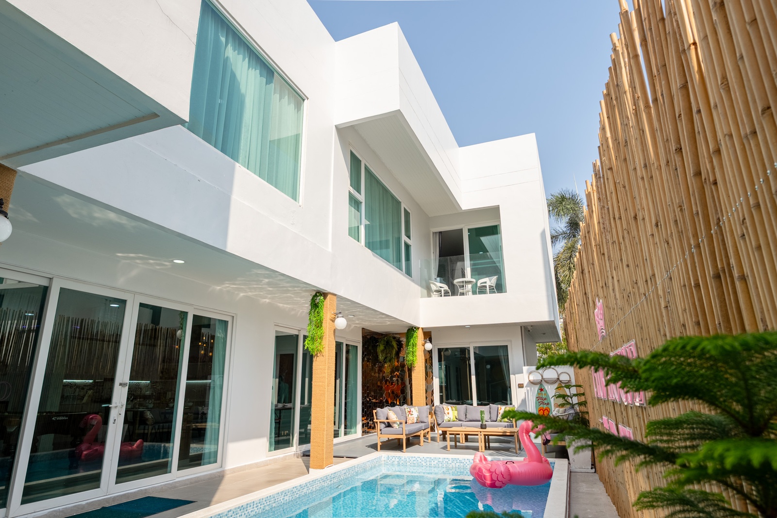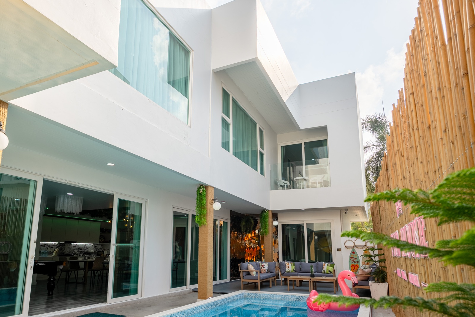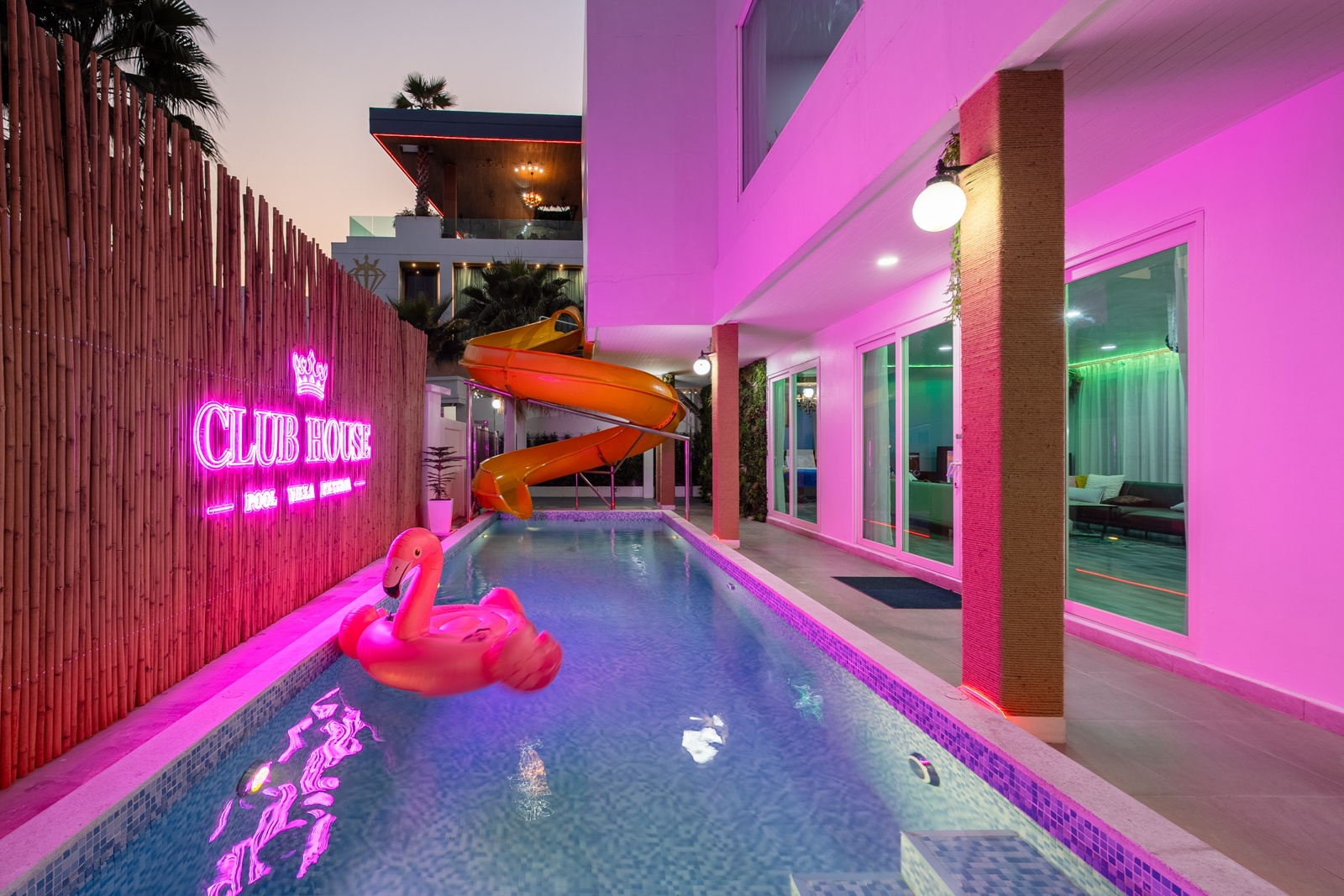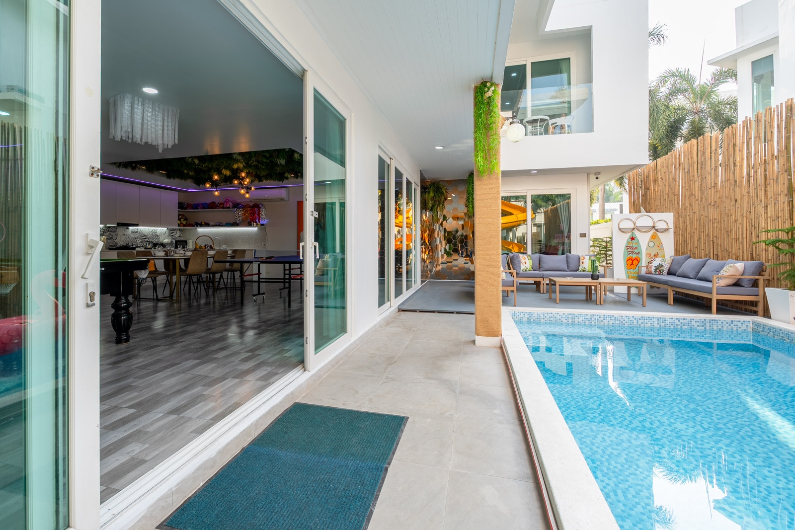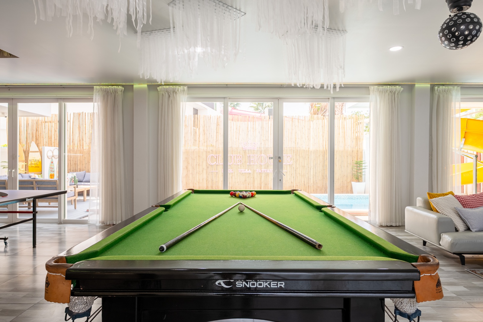 CLUB House Pool Villa Pattaya - This beautifully designed holiday villa spans 2 storeys and offers guests a luxurious and private retreat, complete with its own swimming pool and waterslide. The outdoor living and dining areas are spacious, shaded, and elegantly furnished, creating the perfect setting for relaxing by the pool or enjoying time together in comfort. The villa features 7 stylish bedrooms, 6 of which have en-suite bathrooms, plus, there is an additional guest toilet for convenience. All rooms are furnished in a contemporary style with a modern, relaxed holiday atmosphere. The villa comfortably accommodates large groups and families, making it ideal for both leisure and special occasions. The ground floor boasts a bright open-plan living area with dining space and a modern fully equipped kitchen, perfect for guests who enjoy self-catering. The villa is very well equipped with LCD TV, full air-conditioning throughout, and high-speed Wi-Fi. Furnishings and décor are modern, elegant, and comfortable, designed to provide a true home-away-from-home experience. For entertainment, guests can enjoy the pool table for private games, as well as a karaoke sound box for fun evenings together. For your peace of mind, the villa is fitted with a safety box and benefits from additional security at the main gate. Your reservation rate includes electricity and water usage, Wi-Fi, safety box, and the service of a private villa manager to assist you during your stay. Fresh towels, bed linen, toiletries, and drinking water are provided upon arrival. These items can be replenished or changed for an additional charge — please ask for details. For long-term rental inquiries, please contact our team for special rates. We will be happy to offer you our best price. Welcome to Villa By Owner in Pattaya — where comfort, privacy, and luxury meet.