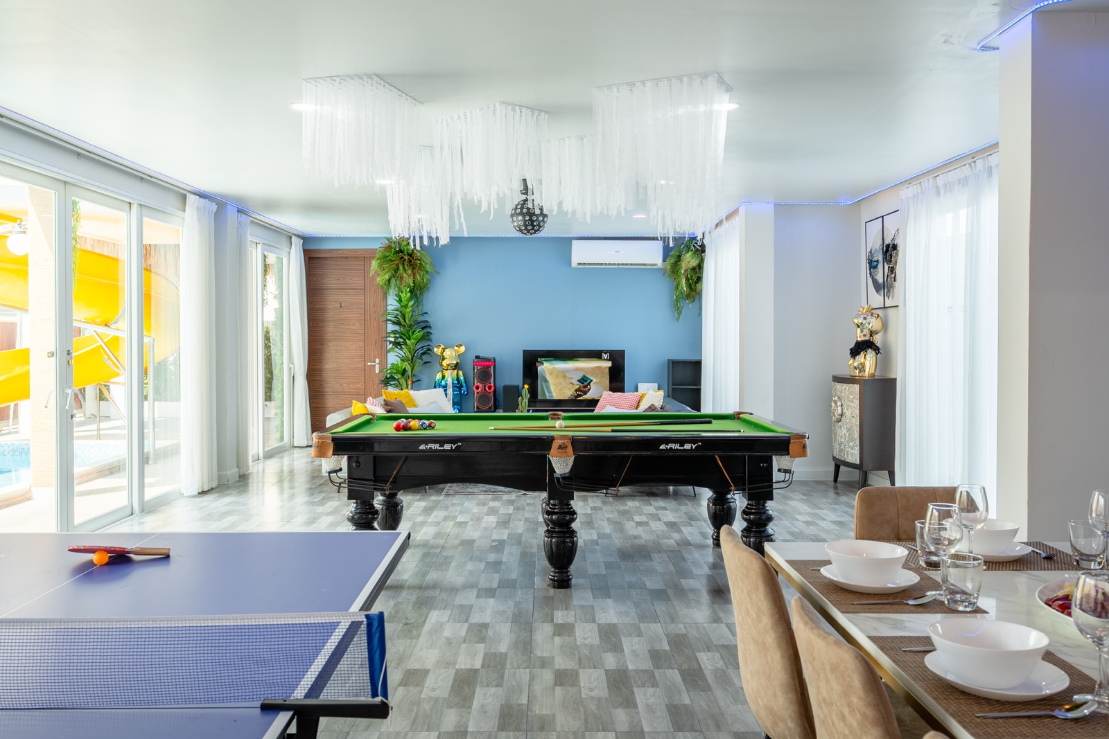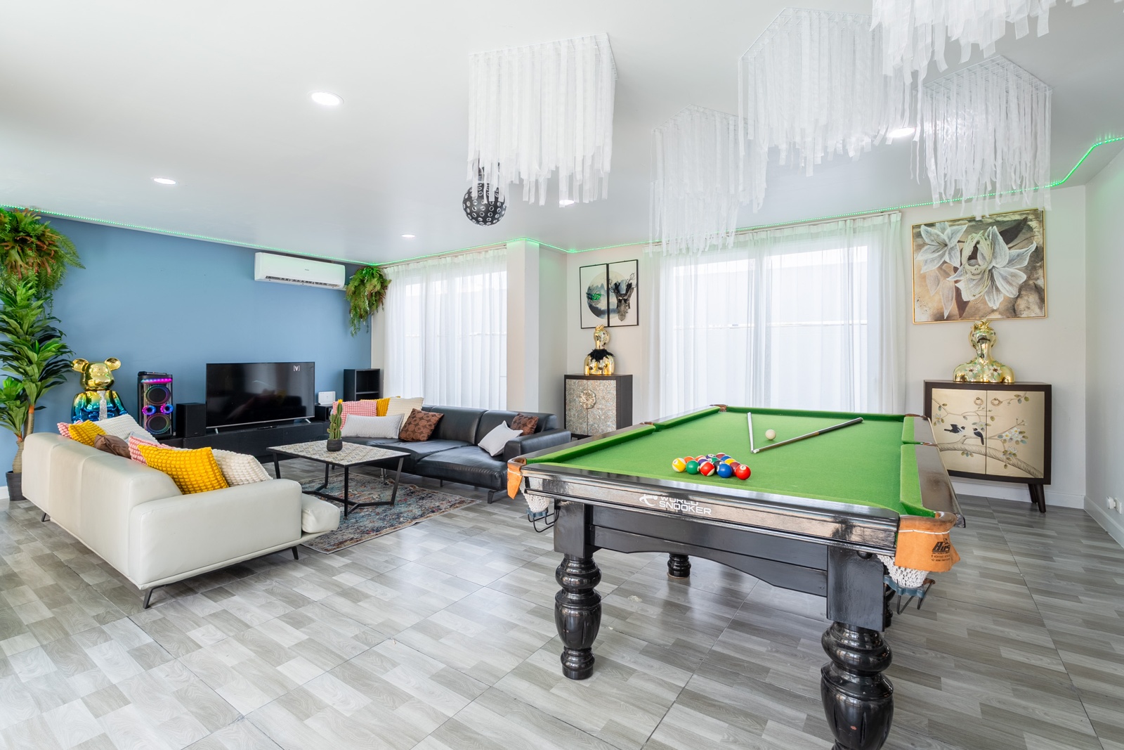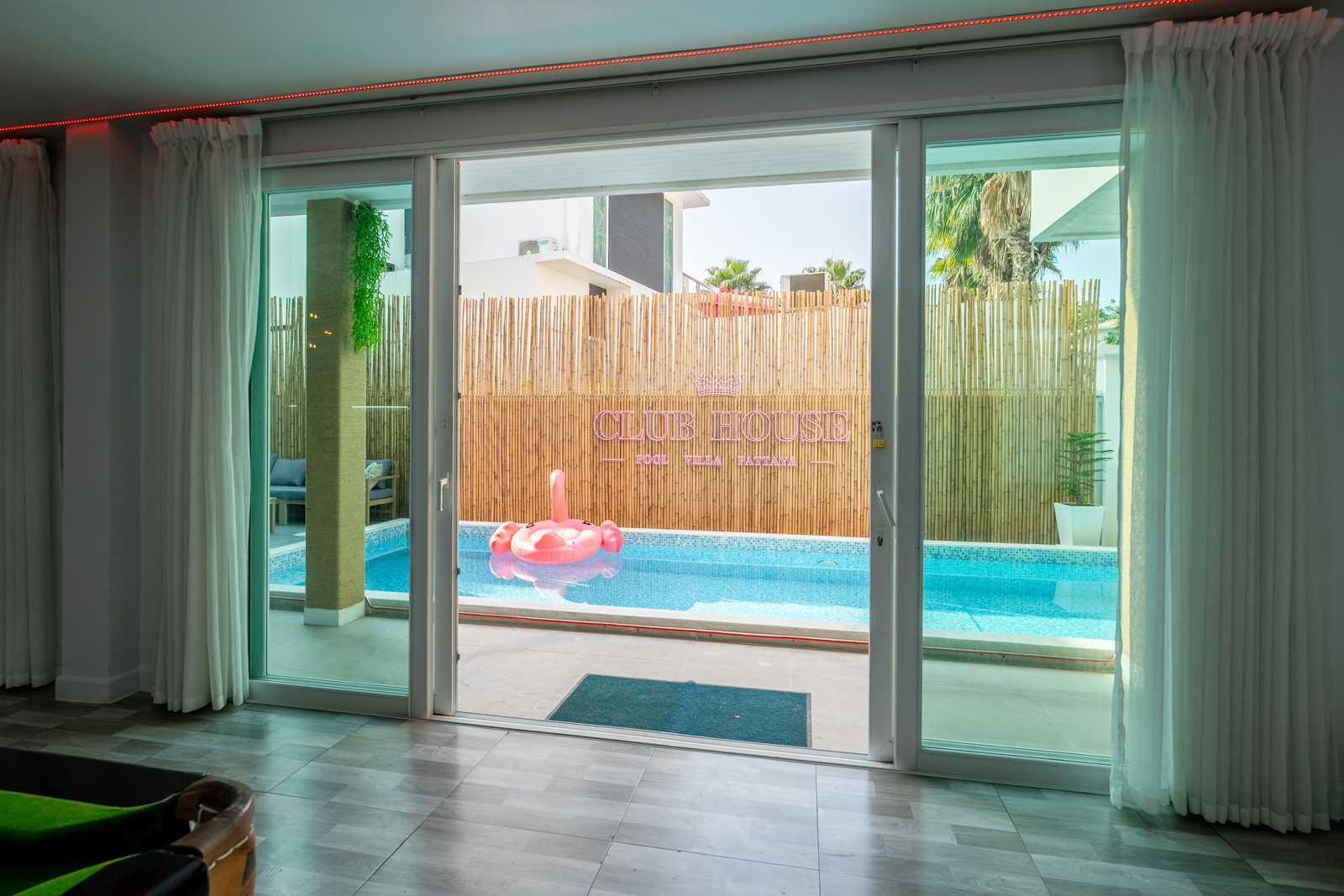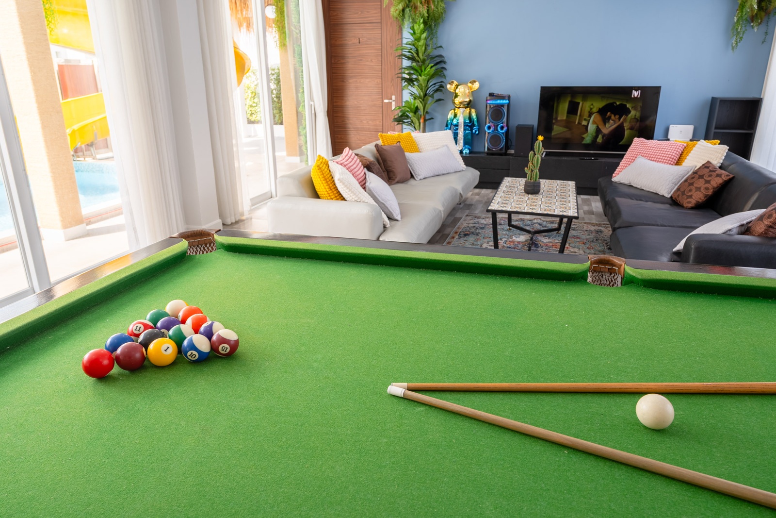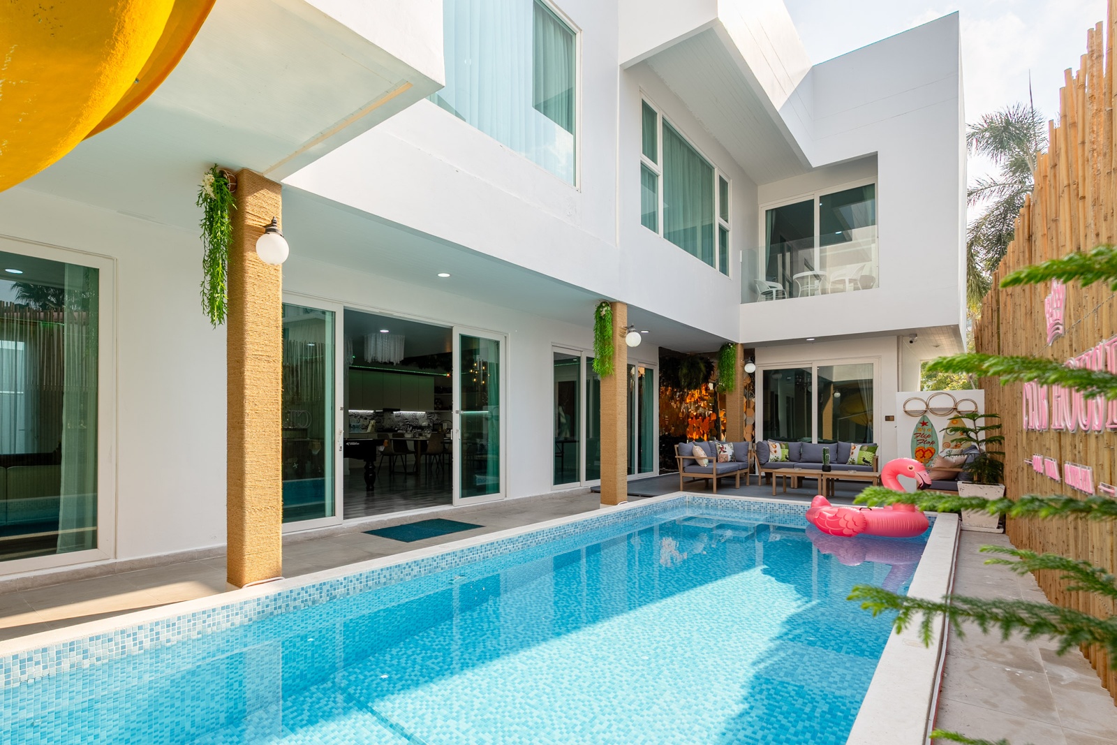 CLUB House Pool Villa Pattaya - This beautifully designed holiday villa spans 2 storeys and offers guests a luxurious and private retreat, complete with its own swimming pool and waterslide. The outdoor living and dining areas are spacious, shaded, and elegantly furnished, creating the perfect setting for relaxing by the pool or enjoying time together in comfort. The villa features 7 stylish bedrooms, 6 of which have en-suite bathrooms, plus, there is an additional guest toilet for convenience. All rooms are furnished in a contemporary style with a modern, relaxed holiday atmosphere. The villa comfortably accommodates large groups and families, making it ideal for both leisure and special occasions. The ground floor boasts a bright open-plan living area with dining space and a modern fully equipped kitchen, perfect for guests who enjoy self-catering. The villa is very well equipped with LCD TV, full air-conditioning throughout, and high-speed Wi-Fi. Furnishings and décor are modern, elegant, and comfortable, designed to provide a true home-away-from-home experience. For entertainment, guests can enjoy the pool table for private games, as well as a karaoke sound box for fun evenings together. For your peace of mind, the villa is fitted with a safety box and benefits from additional security at the main gate. Your reservation rate includes electricity and water usage, Wi-Fi, safety box, and the service of a private villa manager to assist you during your stay. Fresh towels, bed linen, toiletries, and drinking water are provided upon arrival. These items can be replenished or changed for an additional charge — please ask for details. For long-term rental inquiries, please contact our team for special rates. We will be happy to offer you our best price. Welcome to Villa By Owner in Pattaya — where comfort, privacy, and luxury meet.